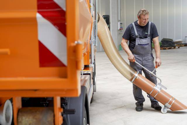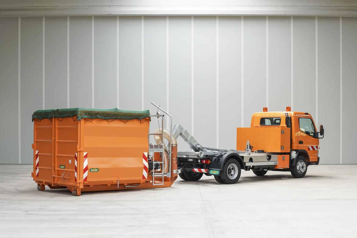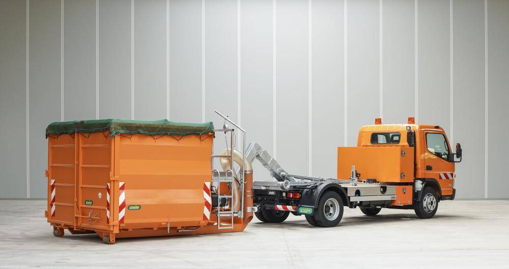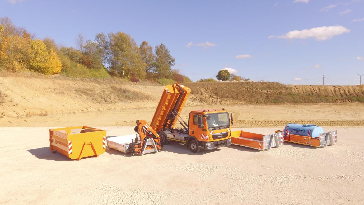 Der Abrollkipper in Verbindung mit einem Laugsaubcontainer erleichtert die Arbeit durch sein effizientes System.