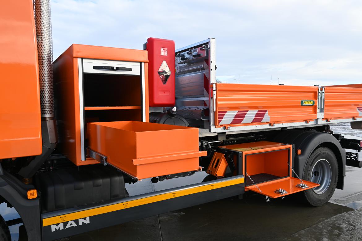 Rückfahrkamera, Rundumkennleuchten, Hydraulik am Heck sowie am Fahrgestell: Werkzeugkisten, Netzboxen, Systemschränke u.v.m..