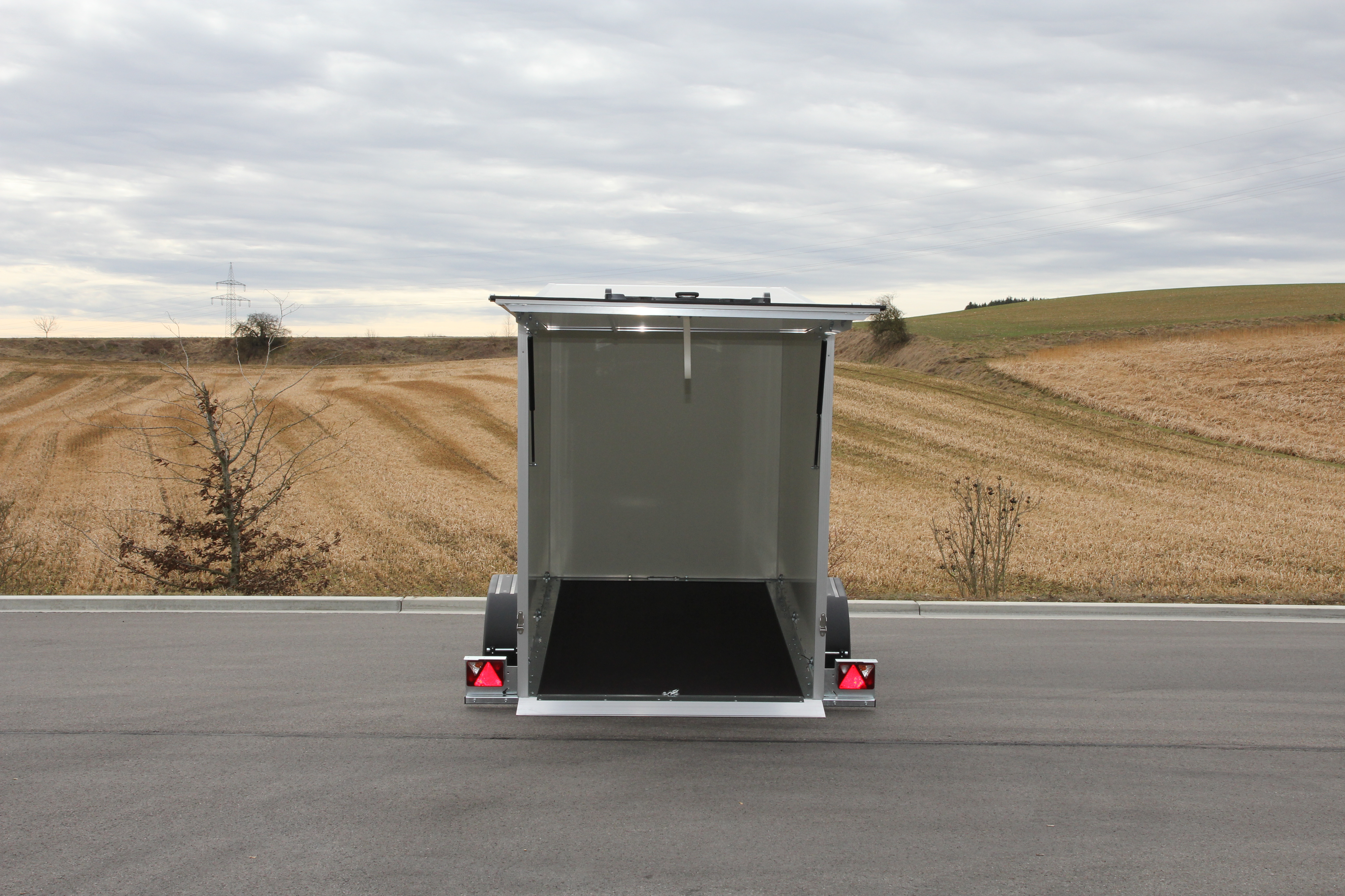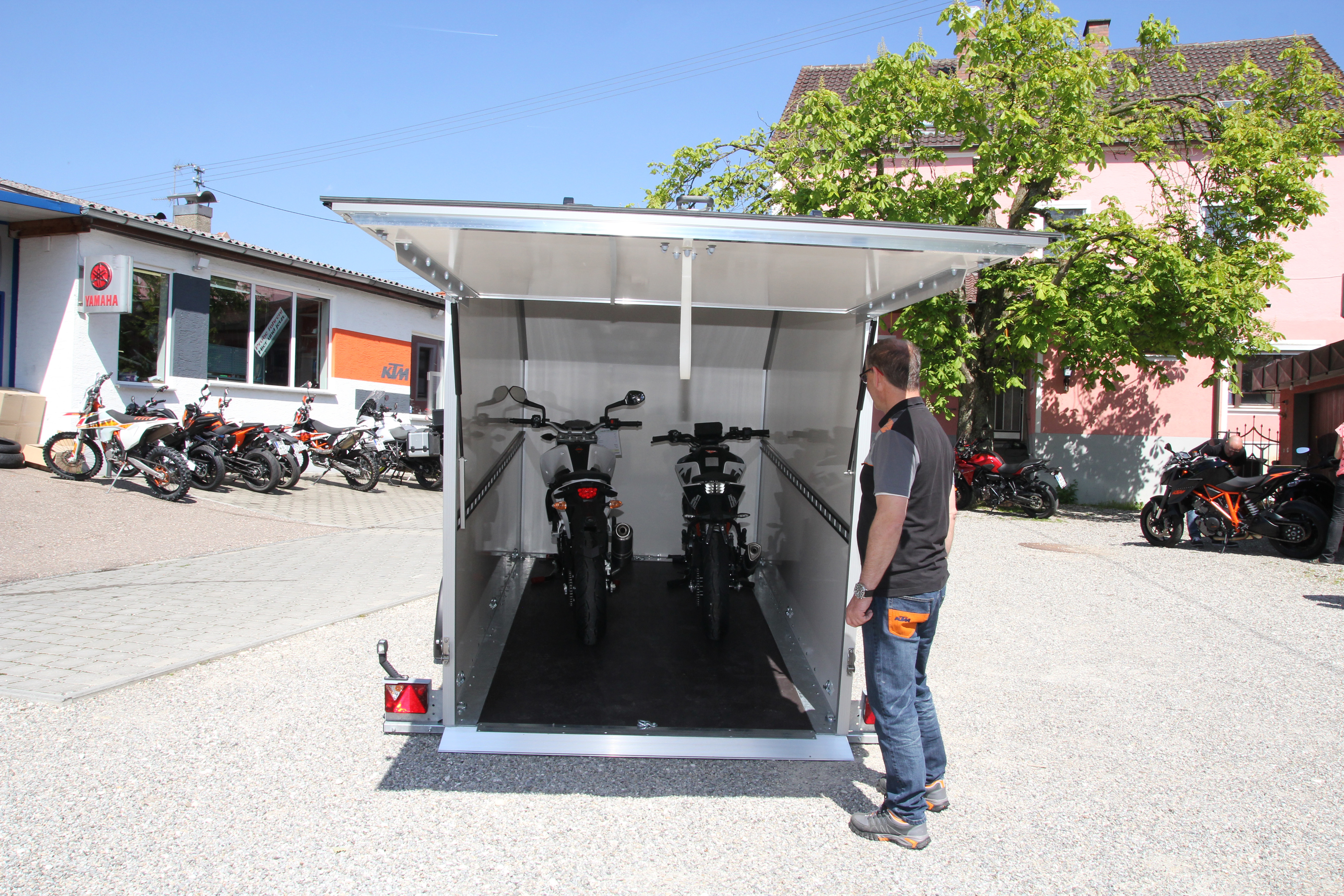 Der Kofferaufbau kann individuell gestaltet werden: in der Höhe, mit Türen, Klappen und Fenstern oder mit abgeschrägter Front. Auch die Innenausstattung erfolgt nach Wunsch, z.B. mit Licht oder Ladungssicherungselementen passend aufs Motorrad abgestimmt. Die geschlossene Kofferbauweise schützt außerdem vor Witterung und Diebstahl.