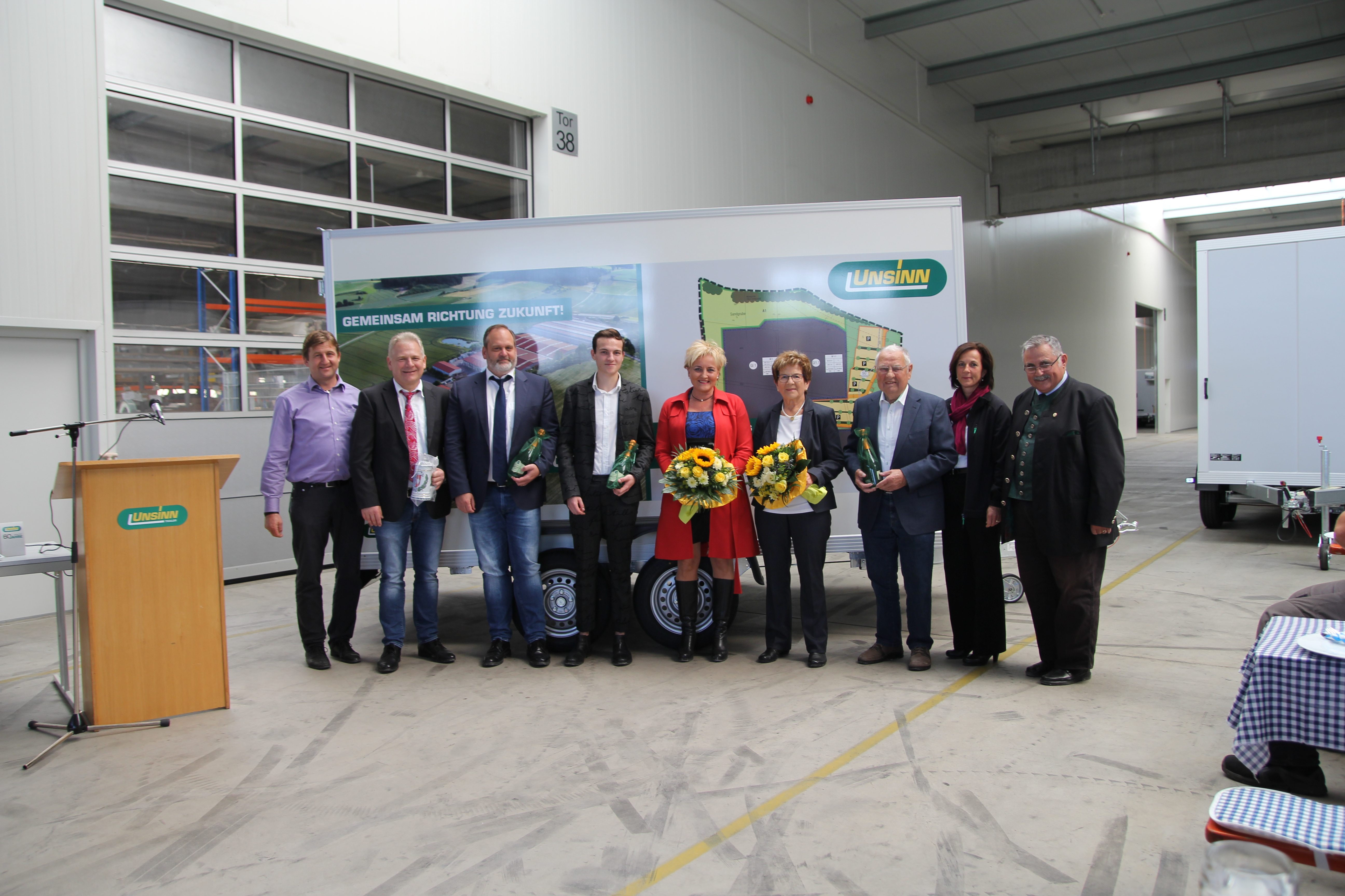 Geschäftsführer Gunnar Bregler, Beirat Josef Unsinn jun., Geschäftsführer Josef Unsinn, Geschäftsführerin Rosa Unsinn, MdL Wolfgang Fackler, Landrat Stefan Rößle, 1. Bürgermeister Robert Ruttmann, Geschäftsführer der Baufirma Ernst Josef Münsinger
