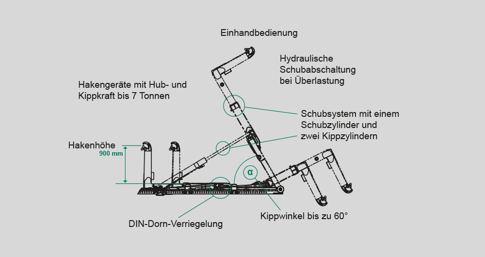 Mit einem Abrollsystem können Lasten sicher bewegt bzw. be- und entladen werden. Der Betrieb des Hakenlifts erfolgt standardmäßig durch eine Hydraulik-Pumpe. Das Abrollsystem besteht aus einem Abrollhaken, der an einem hydraulisch steuerbaren Schubarm befestigt ist. Dieser Haken greift in die entsprechende Aufnahmevorrichtung des Abrollcontainers.