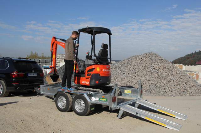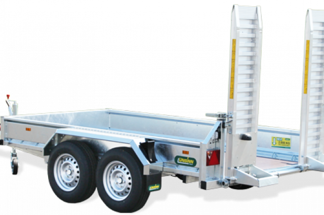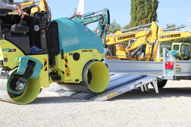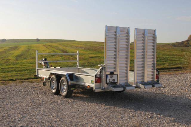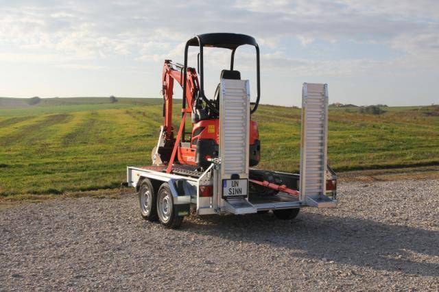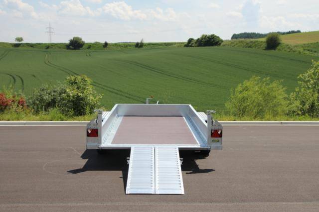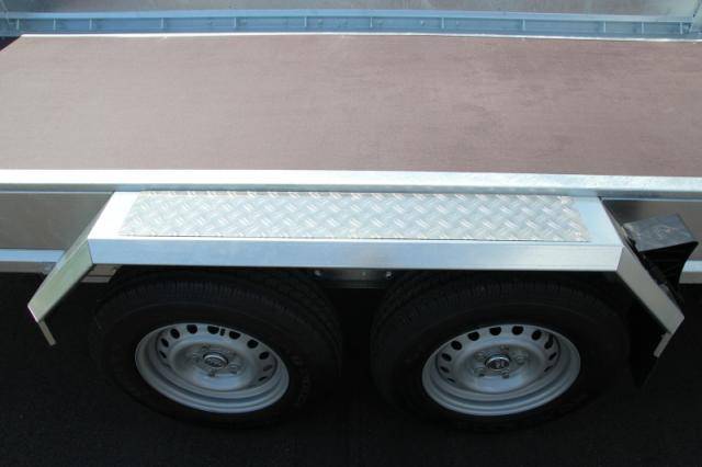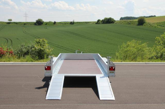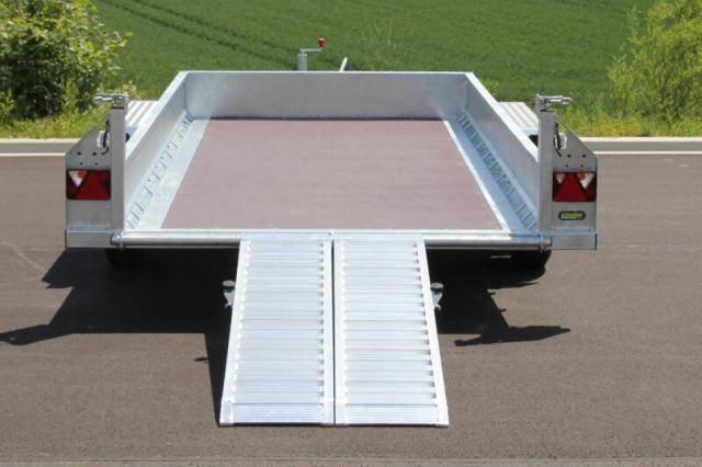 2 abklappbare, seitenverstellbare und seitlich wegschwenkbare Auffahrschienen aus Aluminium mit integrierter Bodenabstützung und einer Tragkraft von 3500 kg/Paar
