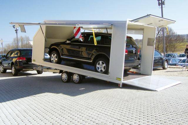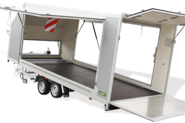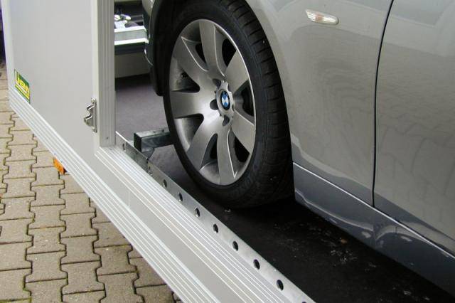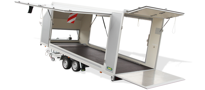 Heckseite mit Klappe nach oben und Auffahrrampe mit Gasfederunterstützung unten