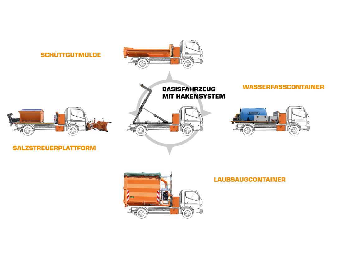 Ein UNSINN Abrollkipper ist das ganze Jahr über vielseitig einsetzbar und somit ein unverzichtbares Allroundfahrzeug. Auf das gewünschte Basisfahrzeug, zum Beispiel von IVECO, FUSO oder MAN, bauen wir den dazu passenden Hakenlift. Durch die Bauweise nach DIN 30722-3 lässt sich ein Container mit Fahrzeugen unterschiedlicher Klassen (bis 12 t zGG) transportieren. Container und Arbeitsgeräte können am Einsatzort bleiben, während das Fahrzeug mehrere Stellen bedient.