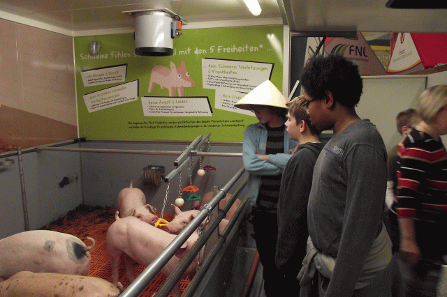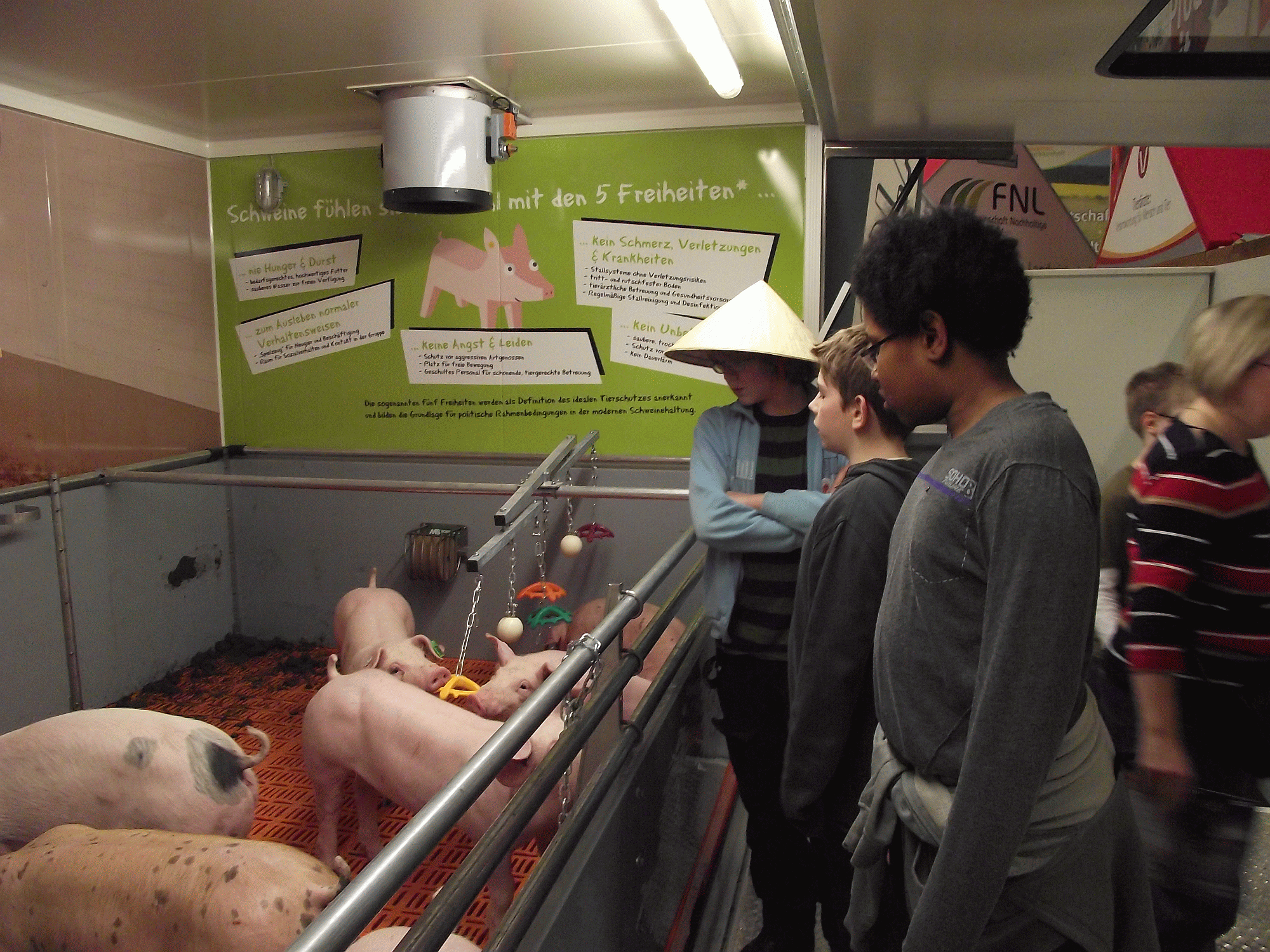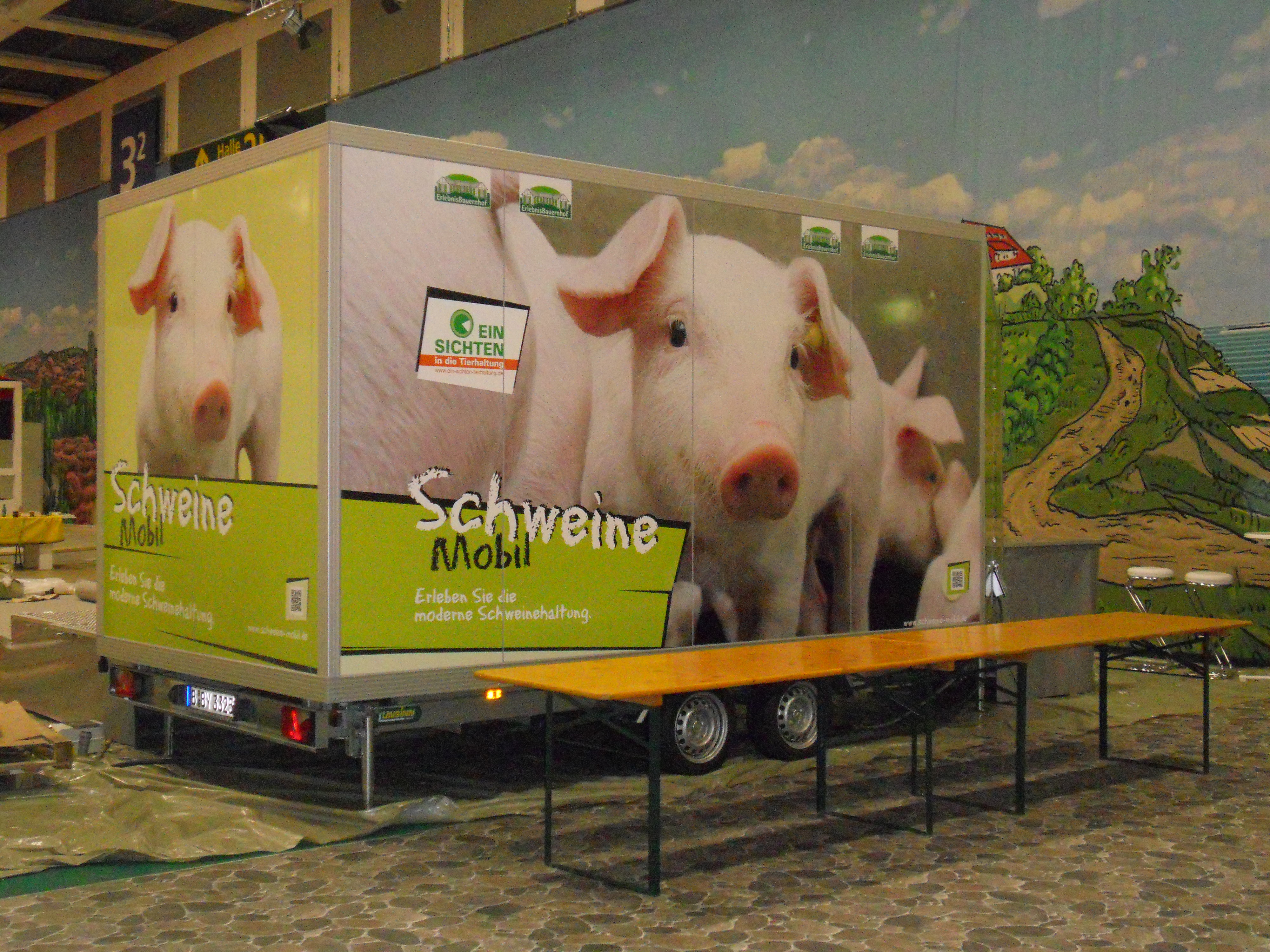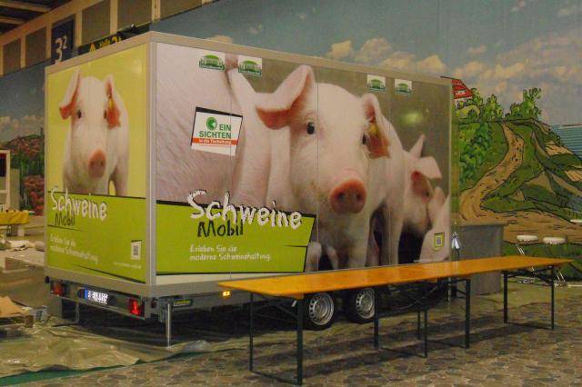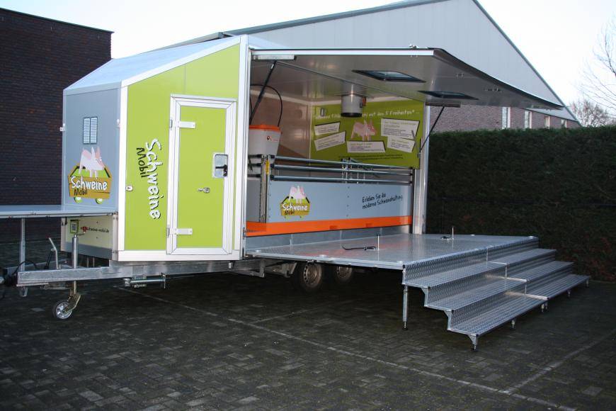 Das SchweineMobil – mit einer integrierten Bucht für Mastferkel – lädt interessierte Verbraucher zum Dialog ein. Realitätsnah zeigt es moderne Schweinehaltung, wie sie bereits heute betrieben wird und beantwortet viele Fragen zu diesem komplexen Thema.