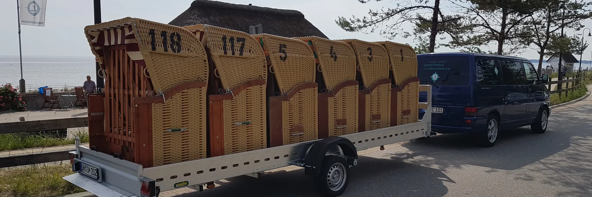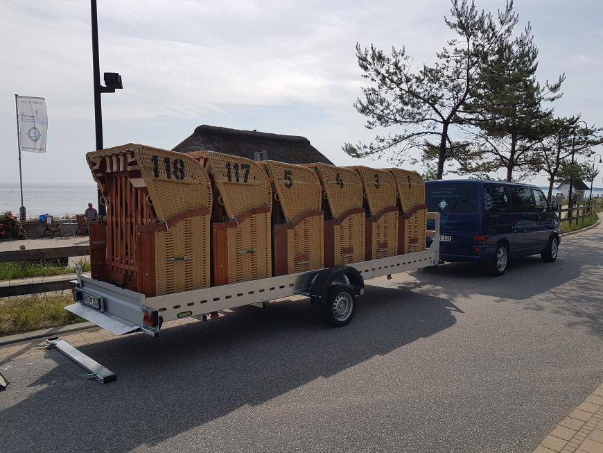 Ein langer Absenkanhänger für den Transport von mehreren Strandkörben zum einfachen Verteilen am Strand an die Besucher der Ostsee. Mit wenigen Handgriffen kann der Strandkorb an der richtigen Position abgestellt werden.