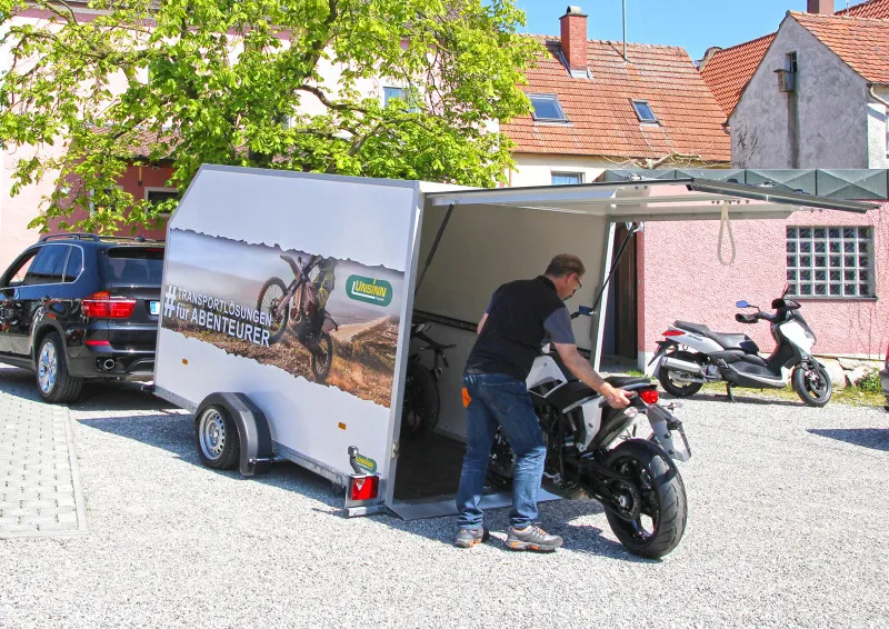 Besonders gut eignet sich dieser PKW Anhänger für den Transport von Motorrädern, da der niedrige Auffahrwinkel einen einfachen Verladevorgang sicherstellt. Ihr Motorrad kann witterungsgeschützt transportiert werden, viele Verzurrmöglichkeiten sorgen für genügend Möglichkeiten zur Ladesicherung. Auch andere kleine Maschinen und Fahrzeuge, wie Rasenmähertraktoren oder kleinere Baumaschinen können ohne Probleme transportiert werden.