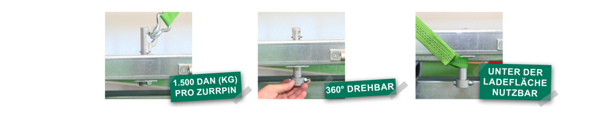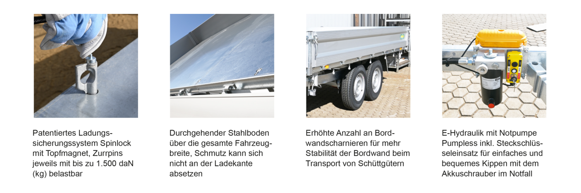 Das patentierte Ladungssicherungssystem Spinlock sorgt dafür, dass jegliche Ladung vorschriftsgemäß gesichert werden kann. Möglich machen das Zurrpins, die flächig im Brückenboden verbaut sind. Die Zurrpins können sowohl auf als auch unter der Ladefläche, beispielsweise mit einer Gurtschlaufe, jeweils bis zu 1.500 daN (kg) belastet werden. Zum Herausziehen der Zurrpins bei geöffneter Bordwand steht ein praktischer Topfmagnet mit Schlüsselanhänger zur Verfügung.